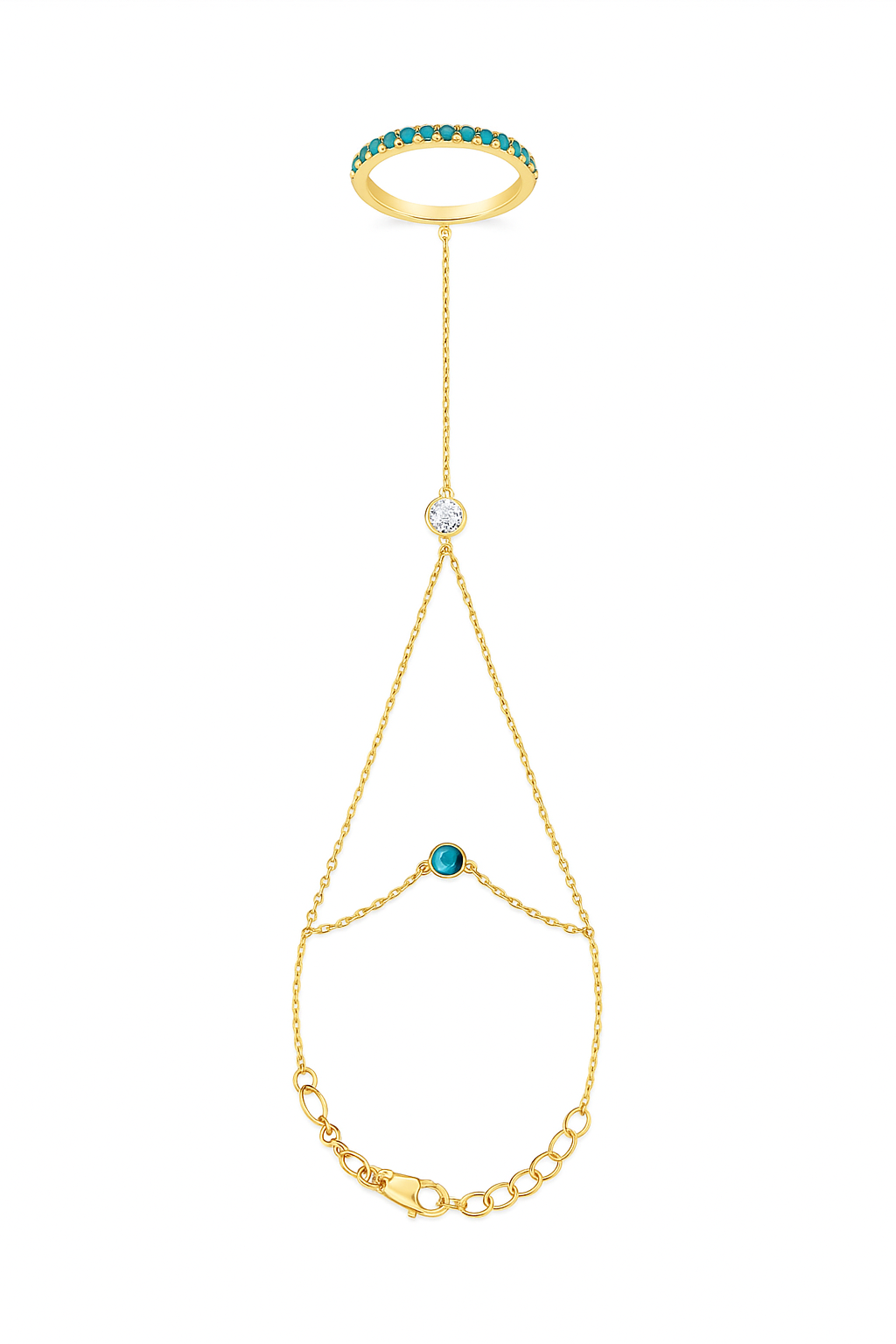 A pavé turquoise eternity ring anchors from the middle finger, while a fine gold chain extends to a bezel-set diamond at the center. A small lobster clasp at the wrist secures the piece with grace.